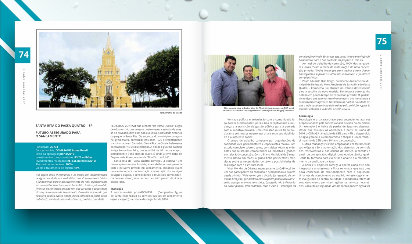 Entre as cidades destacadas este ano está Santa Rita do Passa Quatro, que recebeu o título de Cidade Saneada. A Companhia Águas de Santa Rita S/A (COMASA), concessionária pertencente a GS Inima Brasil, é a responsável pelos serviços de saneamento no município do interior paulista desde junho de 2016. Portanto, o reconhecimento pelos avanços obtidos chega já no primeiro ano de trabalho.