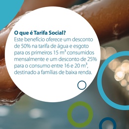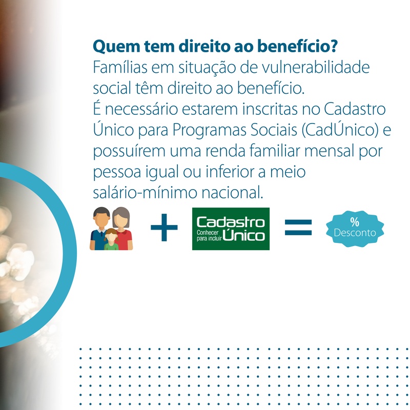 » Tarifa Social: Benefício para famílias de baixa renda inscritas no CadÚnico e em programas sociais.